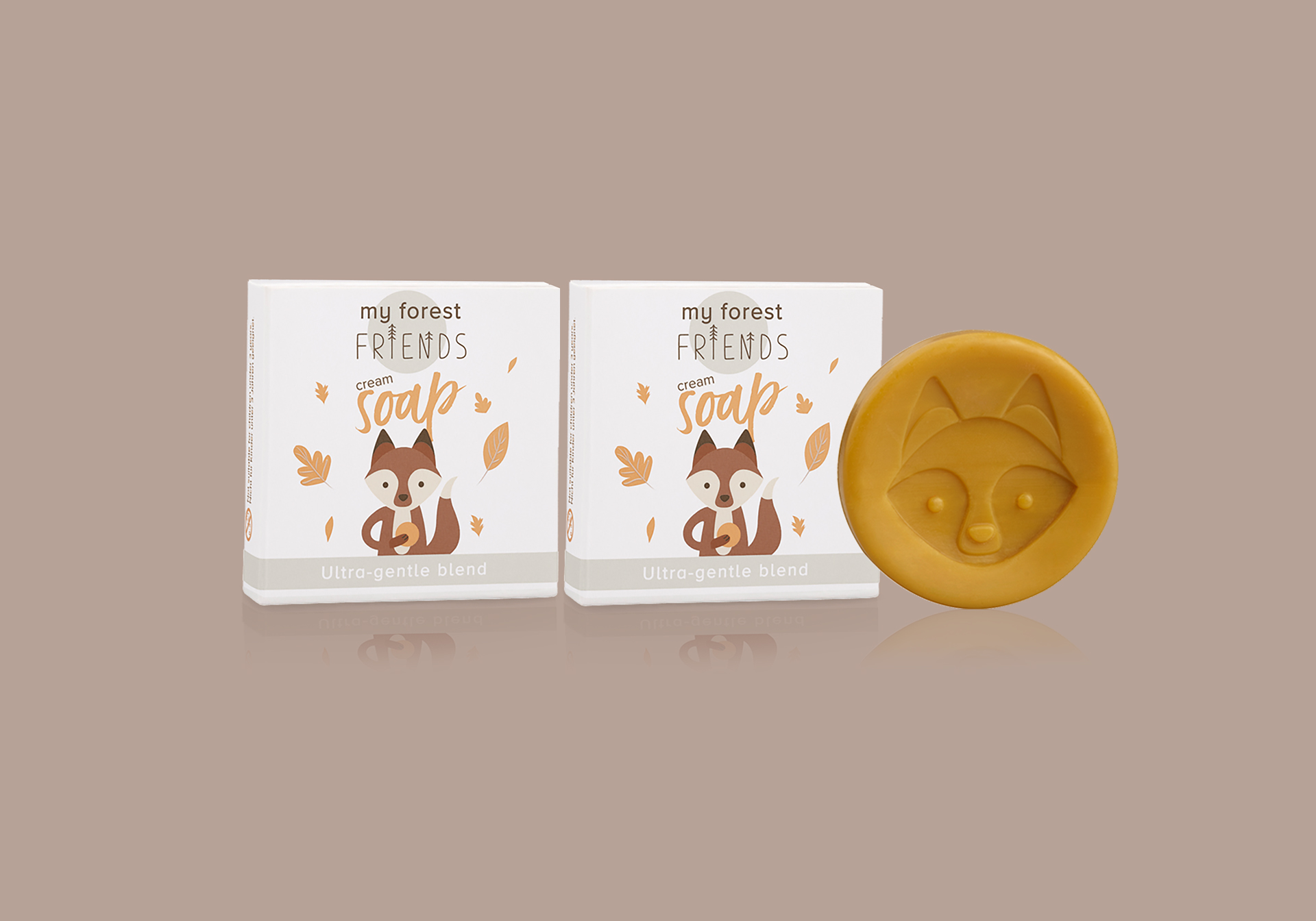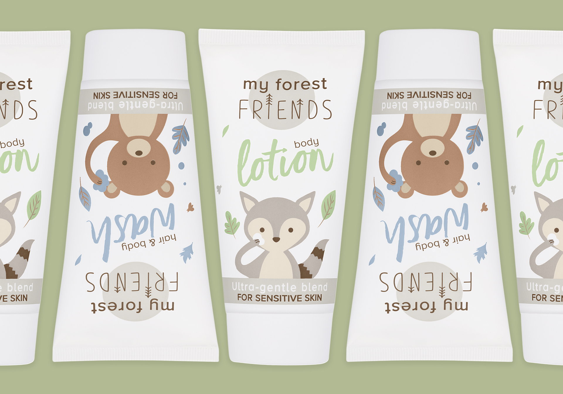 The concept behind the series is “My Forest Friends”. Animals from the forest communicate with care and love. Soft, pastel colours on white were used, which associate naturalness and skin compatibility and are modern at the same time.