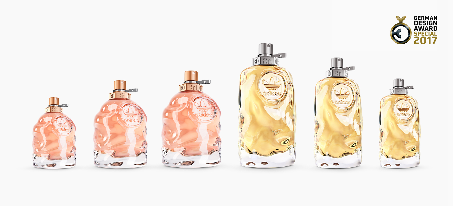 This clip when being pulled releases the fragrance. They are colored Bronze For Her and Steel Grey For Him. The bottle itself is branded with a debossed round adidas trefoil seal. The design was awarded with the “German Design Award Special 2017“.