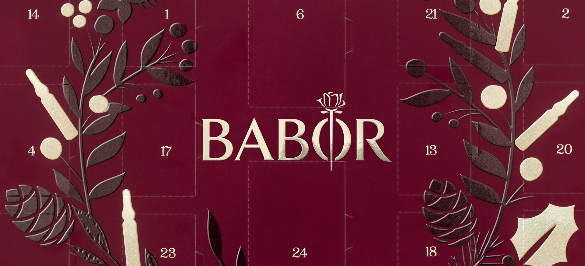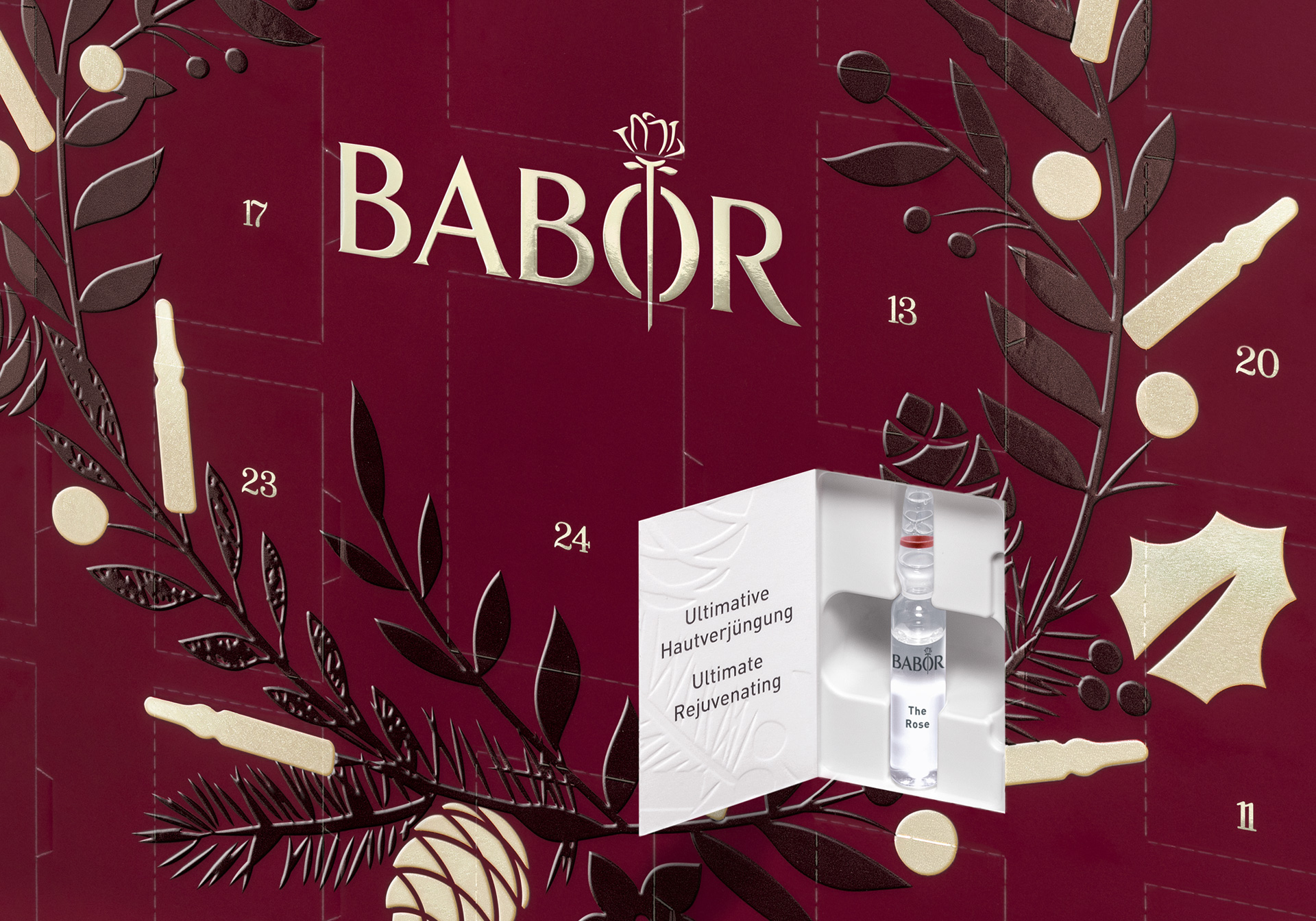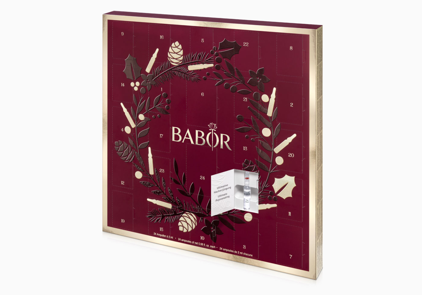 Every year Babor launches a Christmas calendar, which offers the most important product, the ampoule cure, as a 24-day beauty program. The design is of high quality, festive, with contemporary graphics.