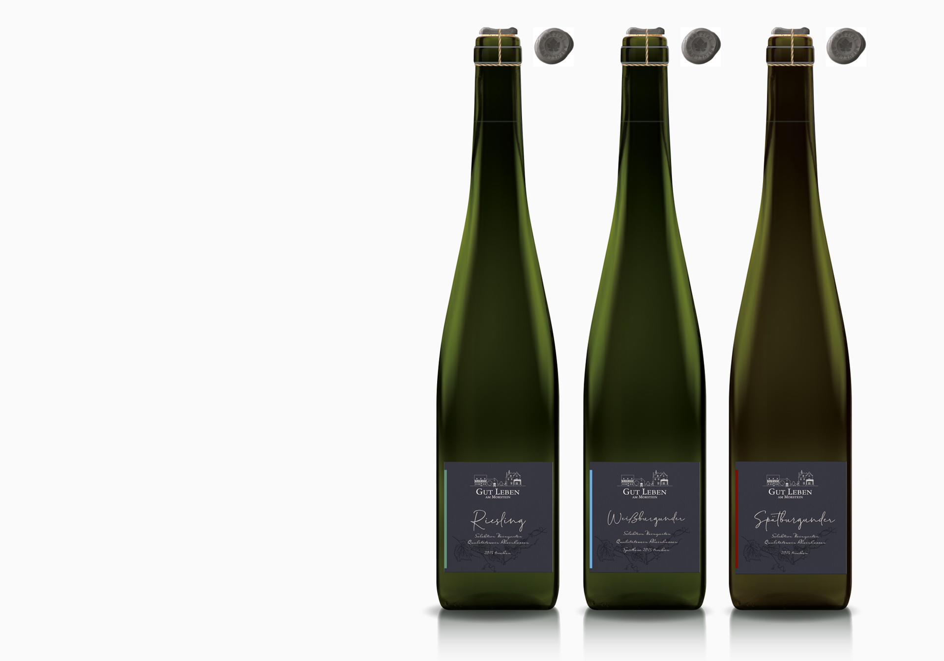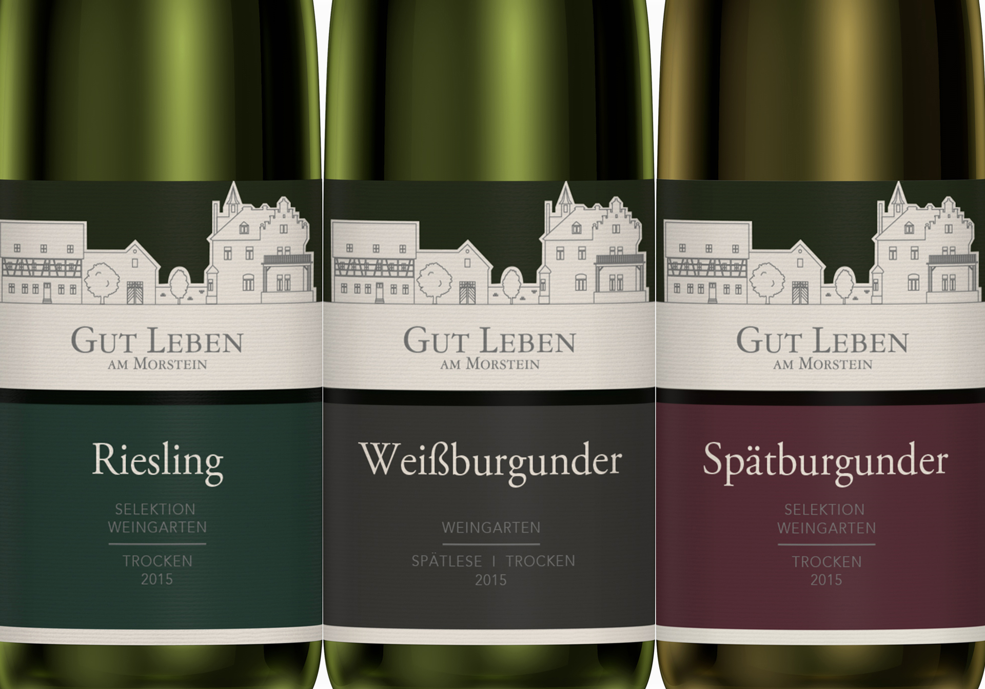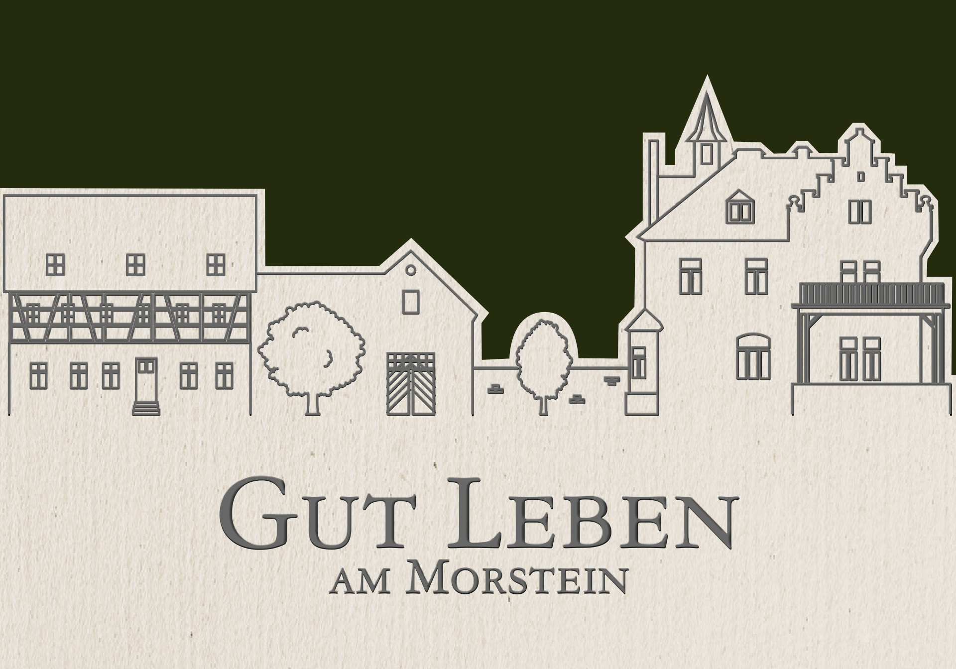 The own gastronomy offers culinary of the region; also the best wines. Together with winemakers of the region “GUT LEBEN am Morstein” has now selected the best and bottled them. We have designed the labels and outfit for this initiative. The selected graphic incorporates the logo with the authentic location (villa and remaining buildings) and depicts it as a silhouette at the top.