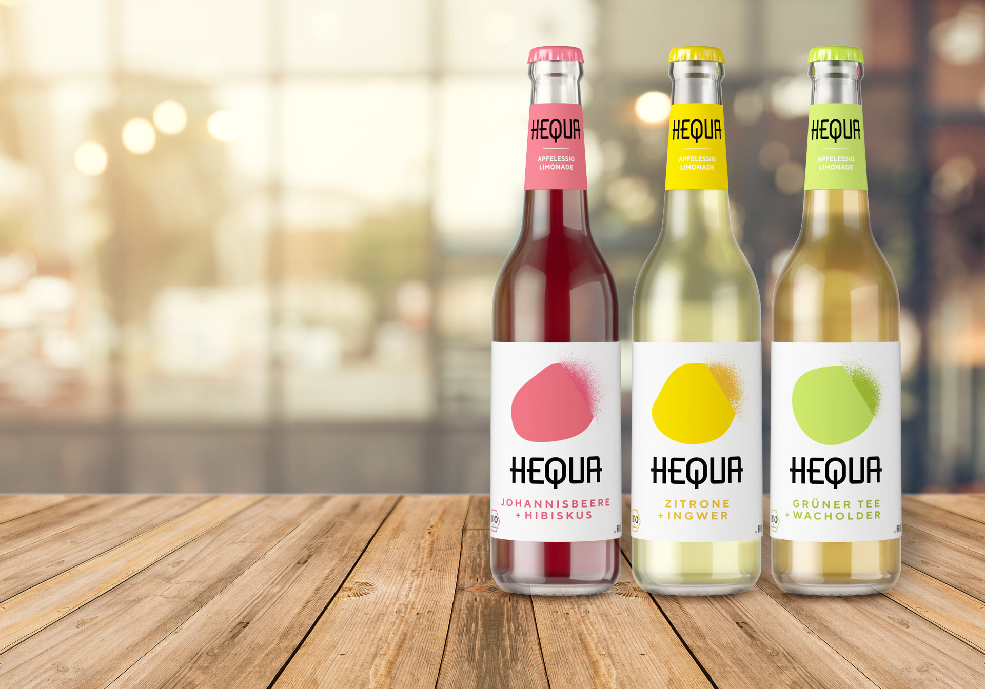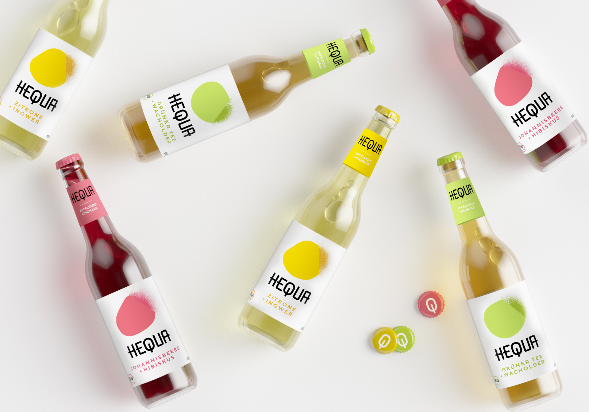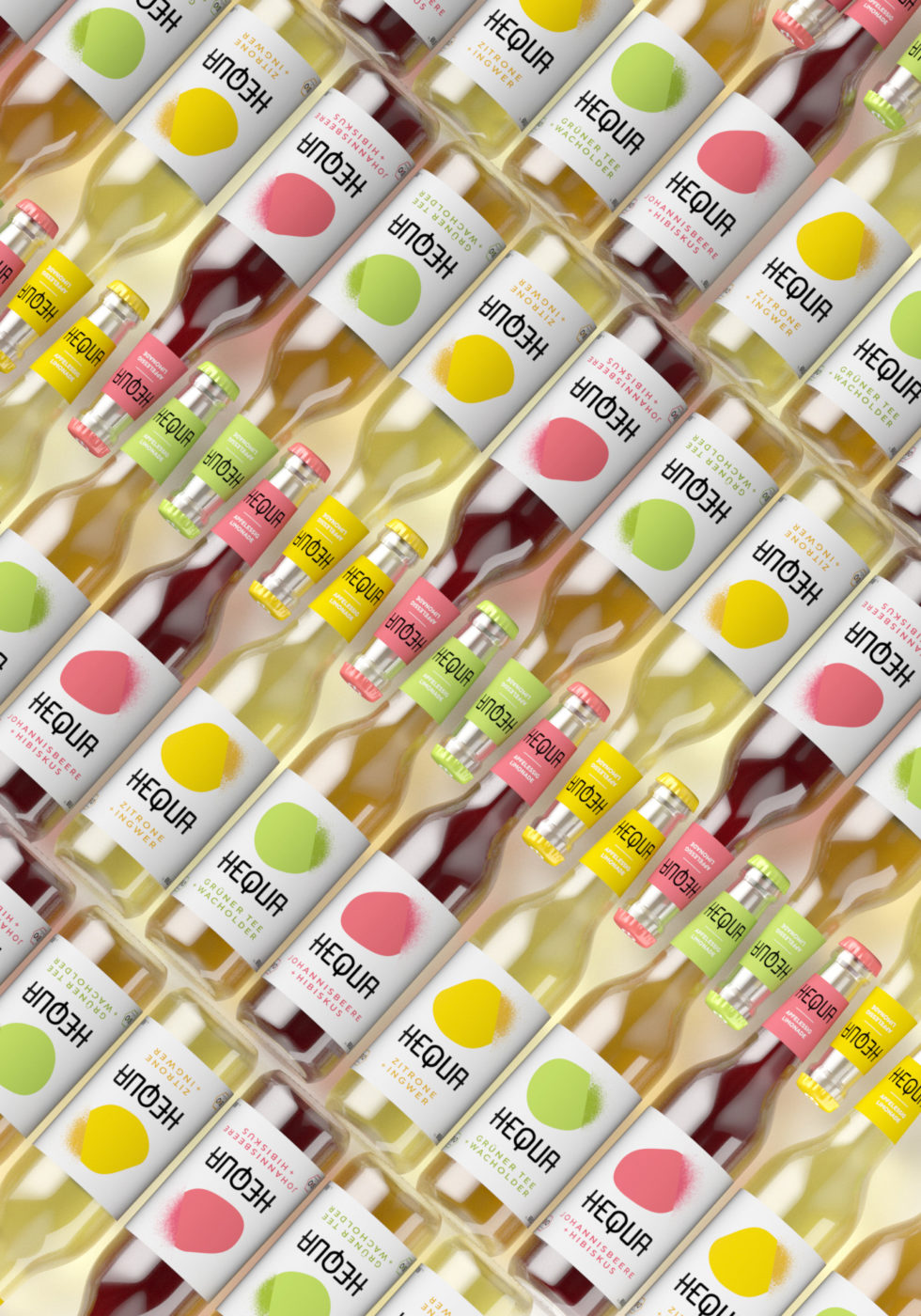 Hequa is a traditional term for beverages produced by fermentation. The range of organic soft drinks is based on cider vinegar. Abstract monochrom organic shapes that dissolve into dots represent the process of fermentation.