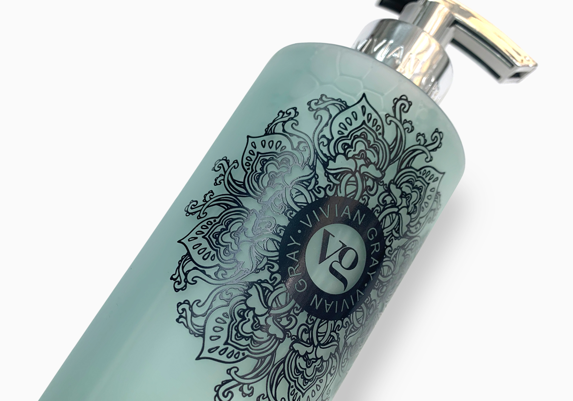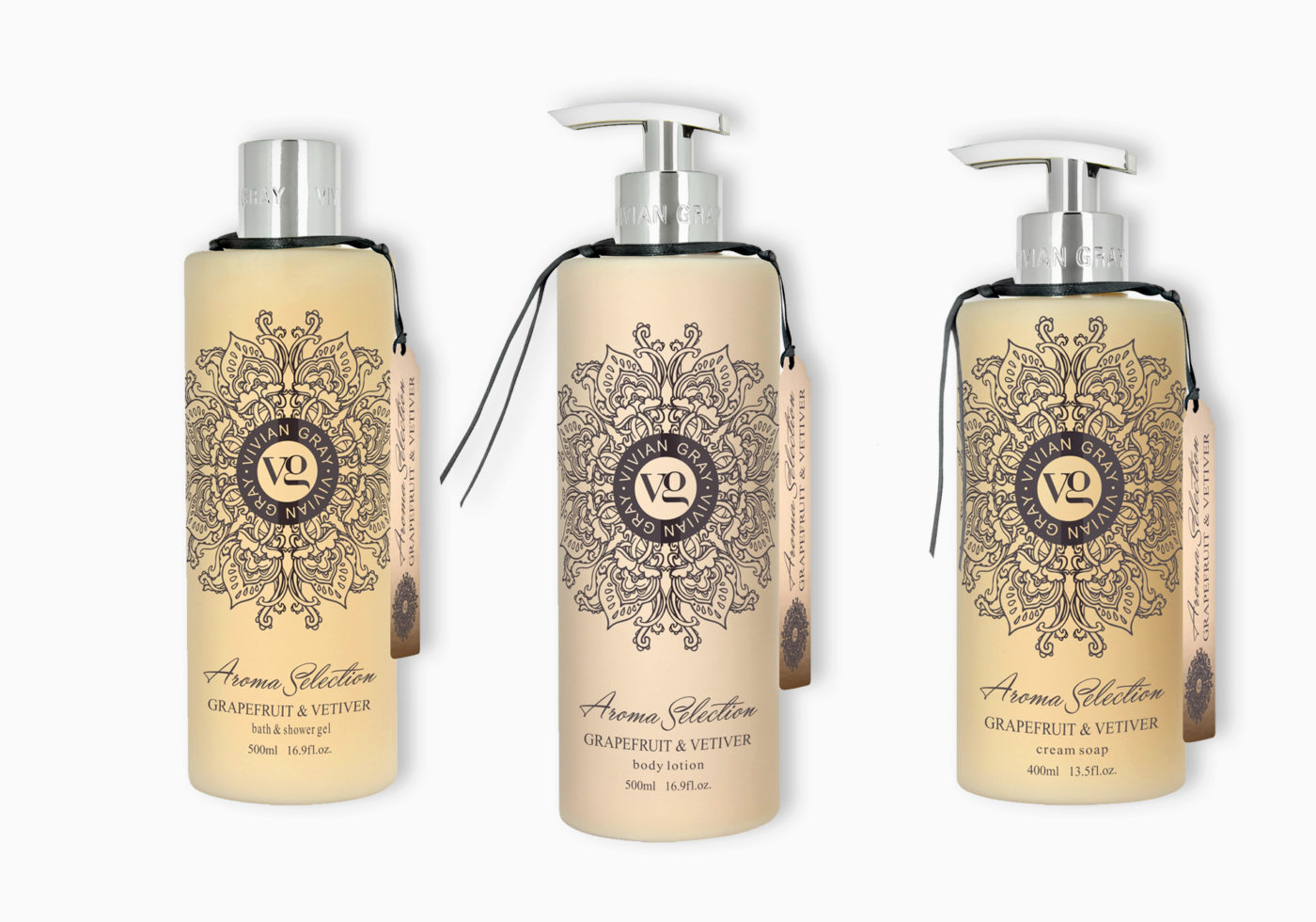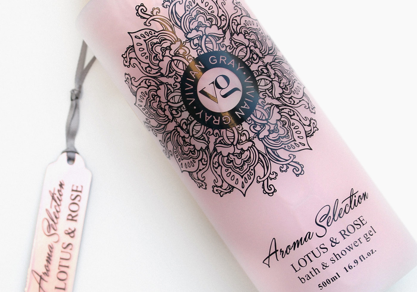 A sensual design for the aromatic body care range Vivian Gray. A flower garland frames the logo and celebrates the aromatic ingredients of the products.