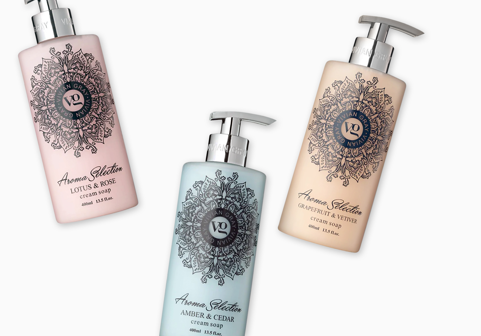 A playful design with impact, contrast and the handwritten quality mark: Aroma Selection. 3 fragrances in 3 product formulas create each a series of body lotion, soap and shower gel.