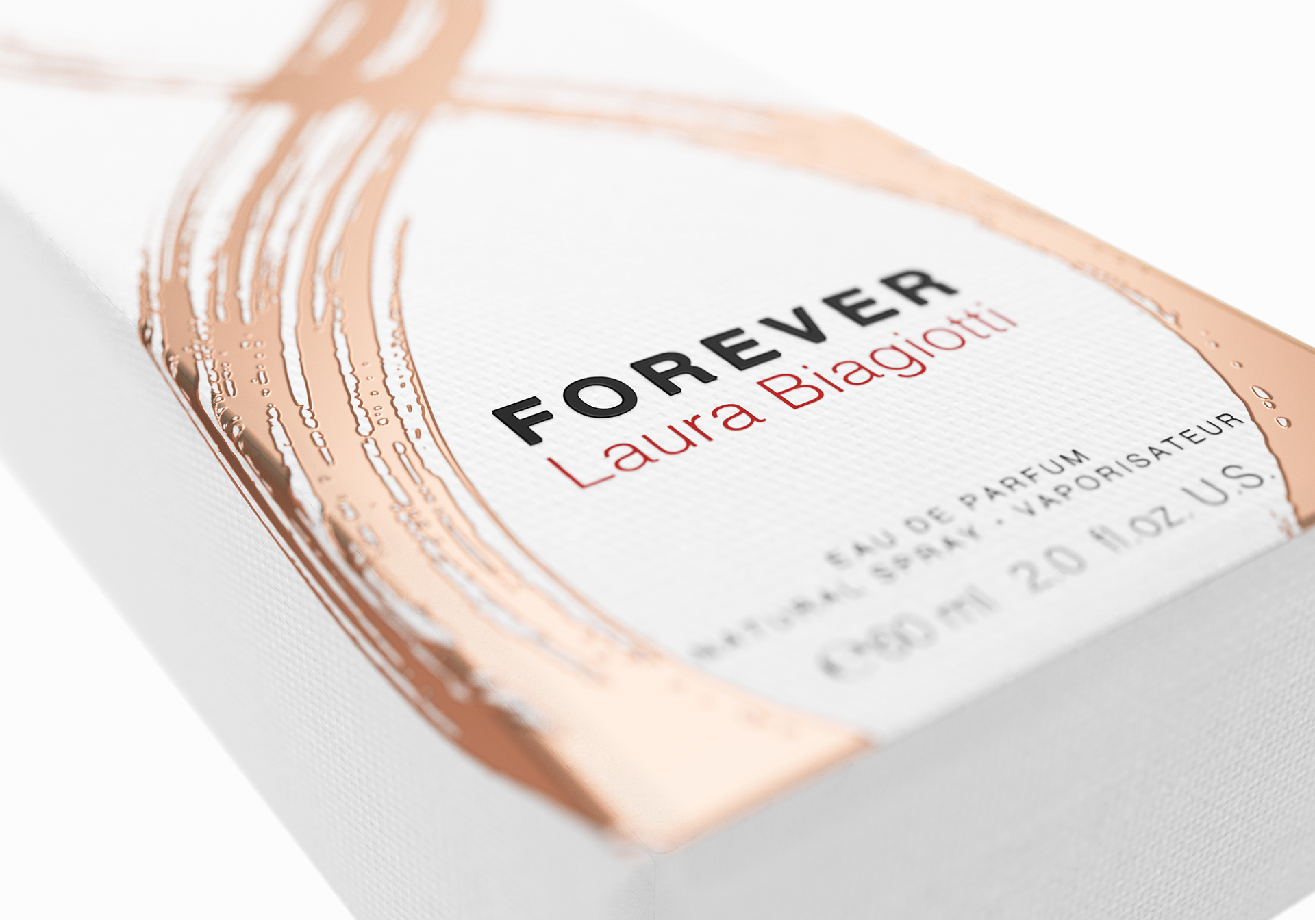 Der weich geschwungene Körper endet in einer kleineren Schlaufe, um die Unendlichkeit zu vervollständigen. Die Grundform der Flasche ist äußerst feminin und schlank, als Ausdruck von Eleganz und Raffinesse. Die Farbwelt spielt ein warmes Gold, ummantelt von metallischen Rosé. Die Faltschachtel trägt ein Unendlichkeitssymbol, das als künstlerischer Pinselstrich in Rosegold auf einer off-white strukturierten Oberfläche steht. Ein Hauch von Rot innerhalb des Brandings verweist auf die Signaturfarbe von Laura Biagiotti.