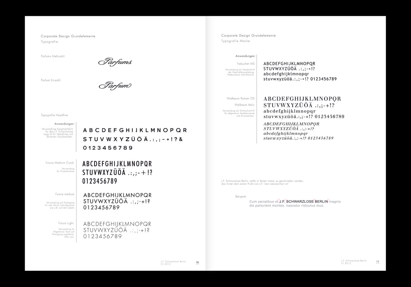 Das Corporate Design der Firma J. F. Schwarzlose wurde von uns entwickelt, um die Designelemente für interne und externe Kommunikation zu definieren. Als Resultat entstand das Design Manual, das alle möglichen Umsetzungen der Hauptmerkale aufzeigt und Anleitung bietet. Es fasst alle Details des Designs zusammen und gibt Hintergrundinformationen. Dargestellt sind zum Beispiel: Schriften und deren Anwendung, Farben und deren Druckumsetzungen.