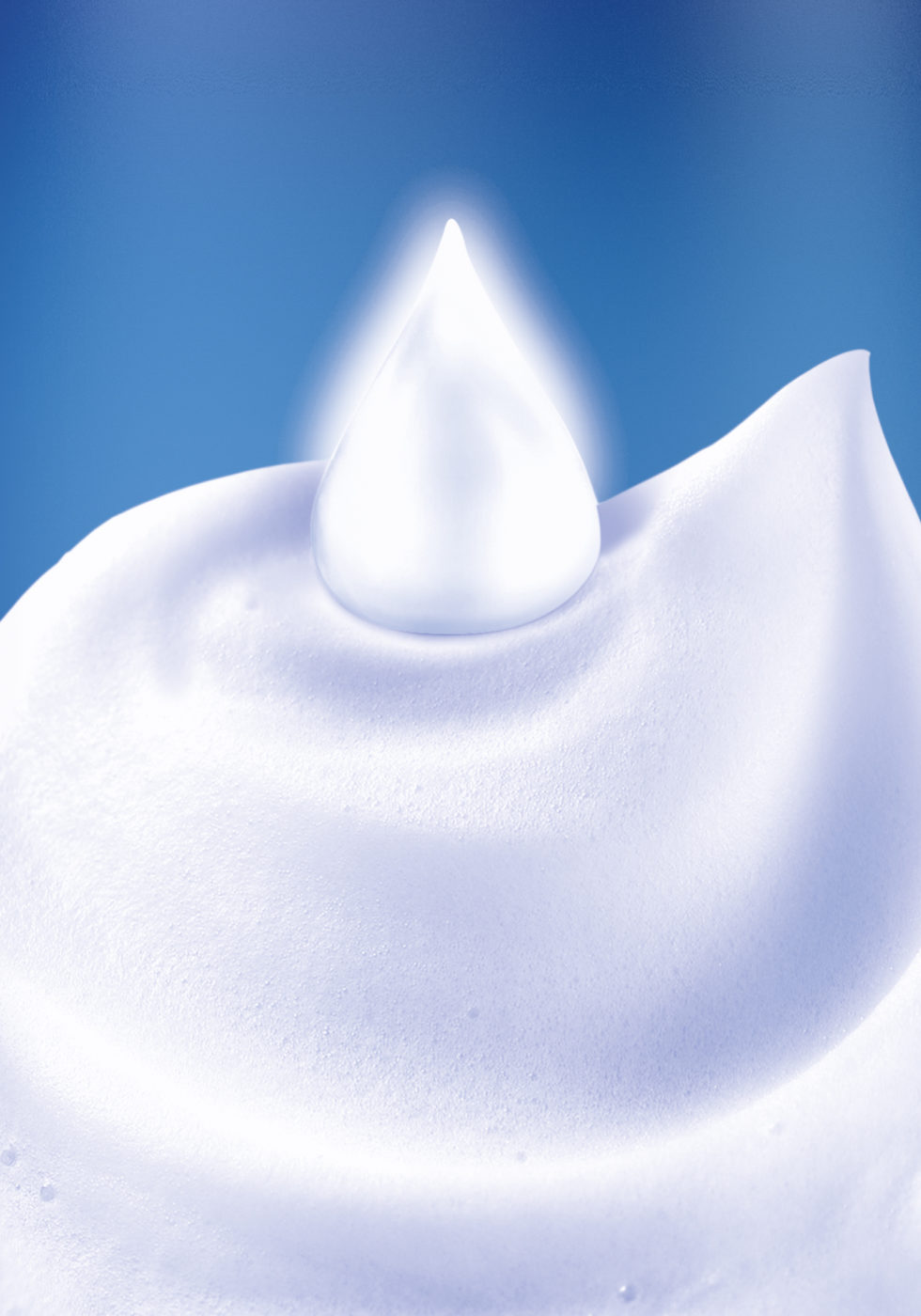 Das Mousse mit seiner cremig-leichten, samtigen Textur, sowie der ikonische Pflegetropfen, werden in der neuen Gestaltung herausgestellt.