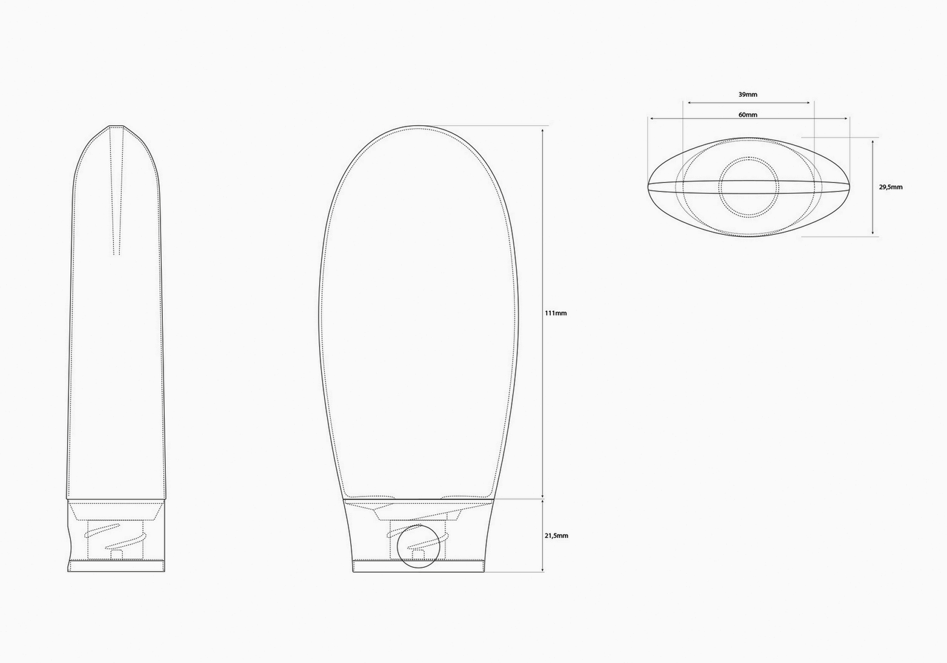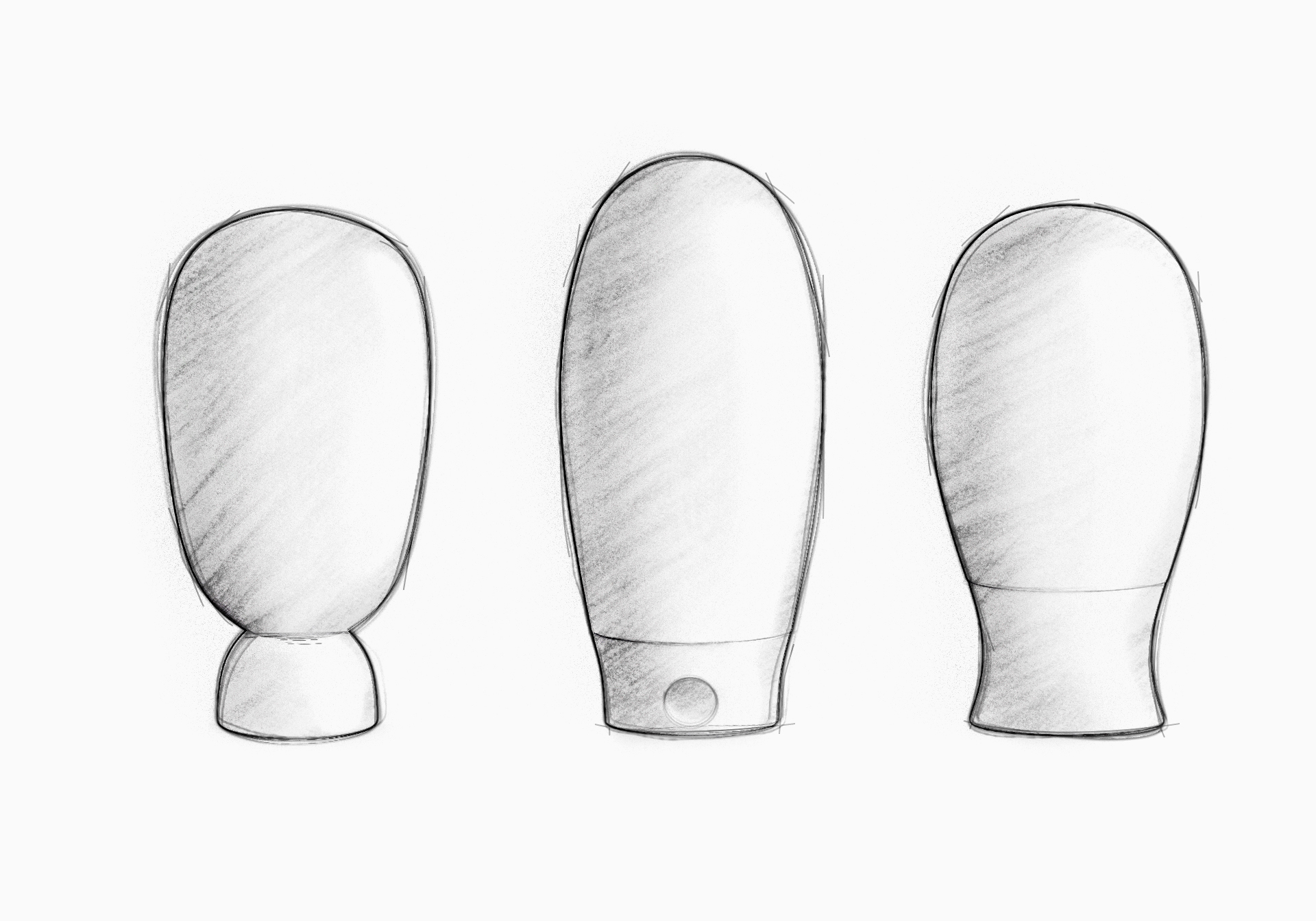 Die Form: ein Handschmeichler, eine „Tottle“ (ein Mix aus Tube und Flasche) – etwas Schönes zum Anfassen – erinnert durch weiche, fließende Konturen an einen „Fäustling“. Die „Softtouch“ Oberfläche unterstreicht dieses taktile Erleben.