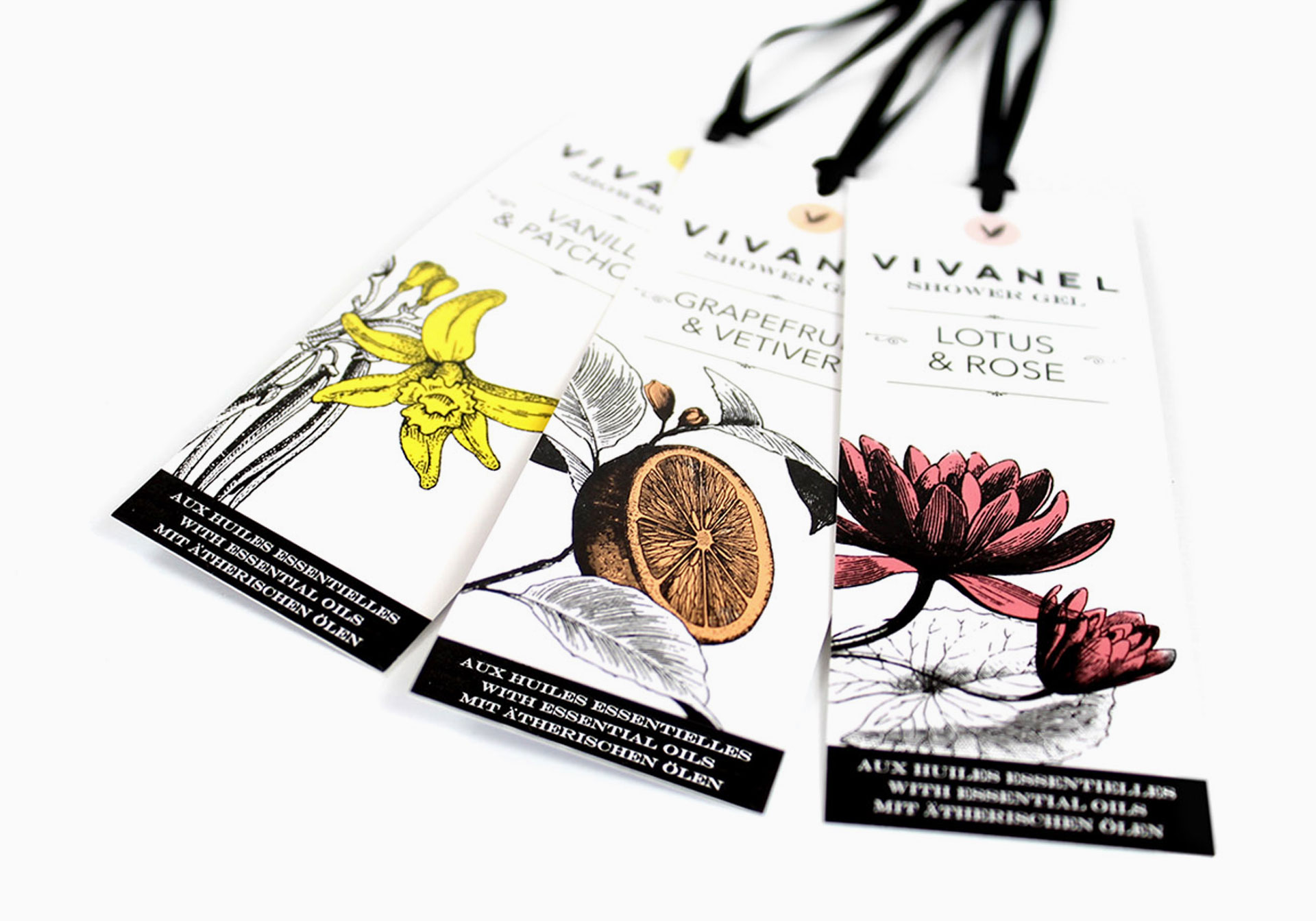 Die neu entwickelte Marke Vivanel ist ein modernes Statement. Es steht für Kompetenz und spielt mit einem V als Blattsymbol, was wiederum Natürlichkeit und Duft assoziiert. Drei verschiedene kolorierte Kräuterdarstellungen repräsentieren die Duftrichtungen.