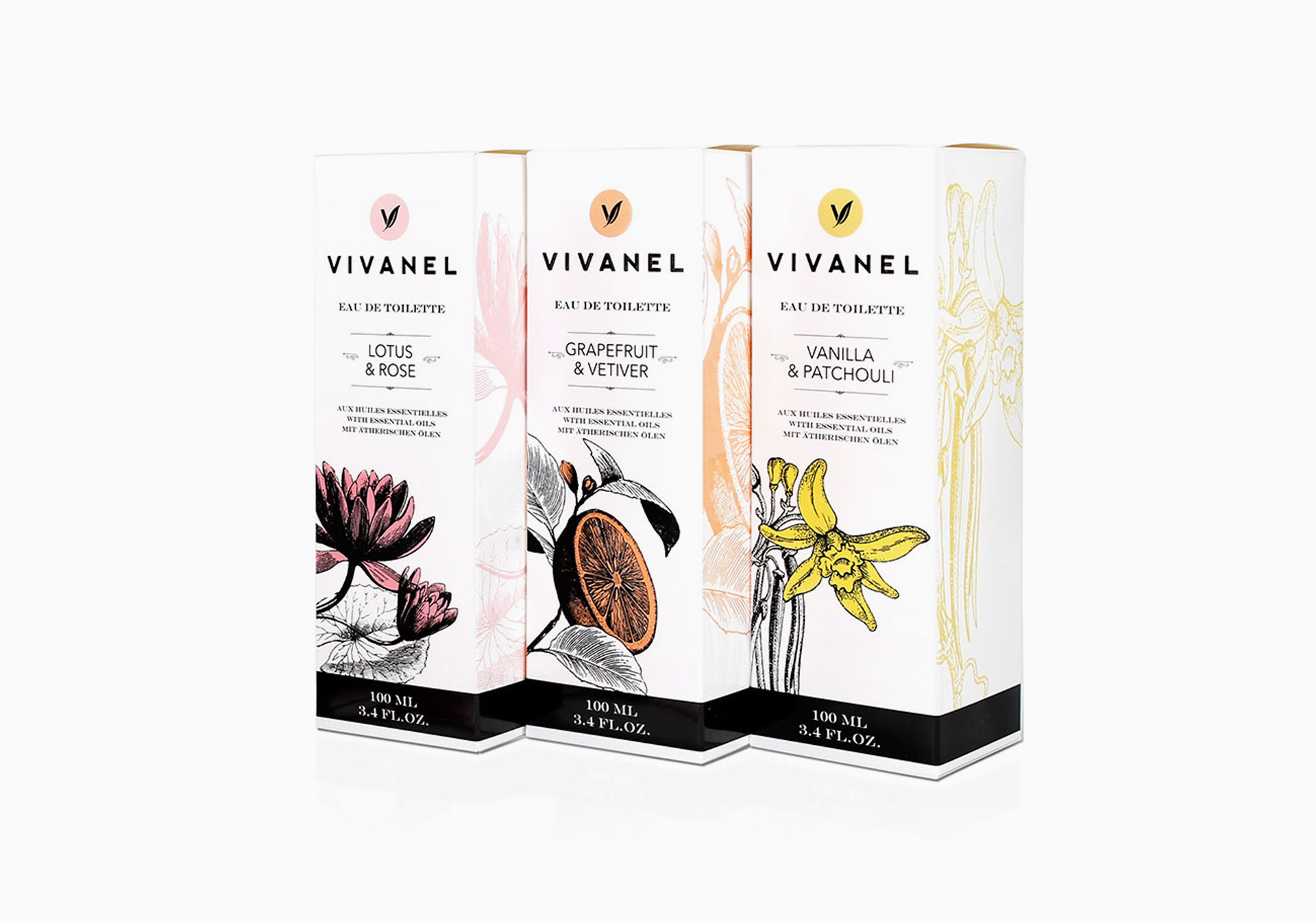 Die neu entwickelte Marke Vivanel ist ein modernes Statement. Es steht für Kompetenz und spielt mit einem V als Blattsymbol, was wiederum Natürlichkeit und Duft assoziiert. Drei verschiedene kolorierte Kräuterdarstellungen repräsentieren die Duftrichtungen.