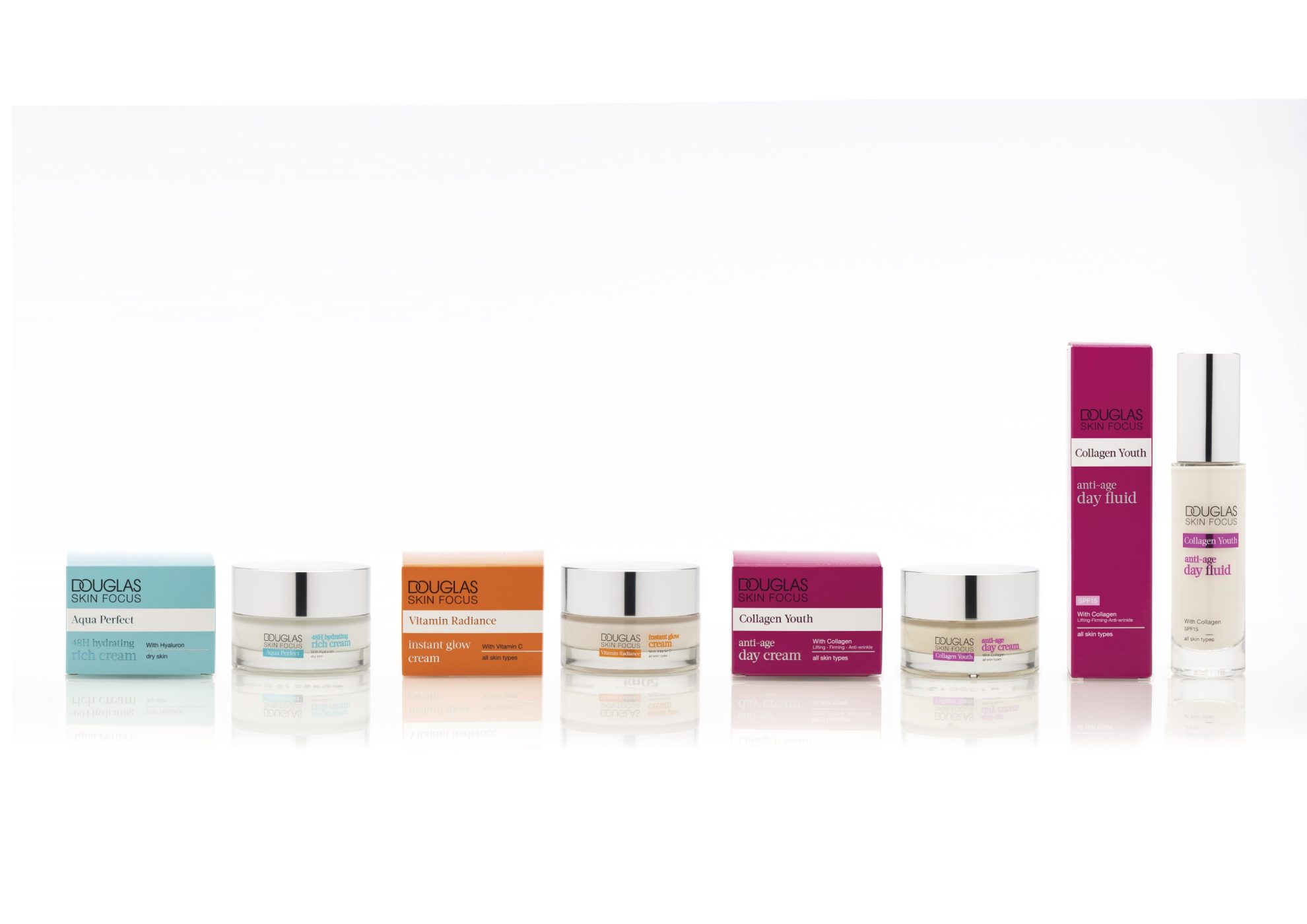 Die 3 verschiedenen Linien sind in Farbgebung und Aussehen selbsterklärend: Vitamin Radiance in leuchtendem Orange, Aqua Perfect in hellem und klarem Blau, Collagen Youth in kräftigem Pink. Die Farben unterstreichen die Pflege Kompetenz, das Layout und die Grafik strukturieren die Informationen klar und verständlich.