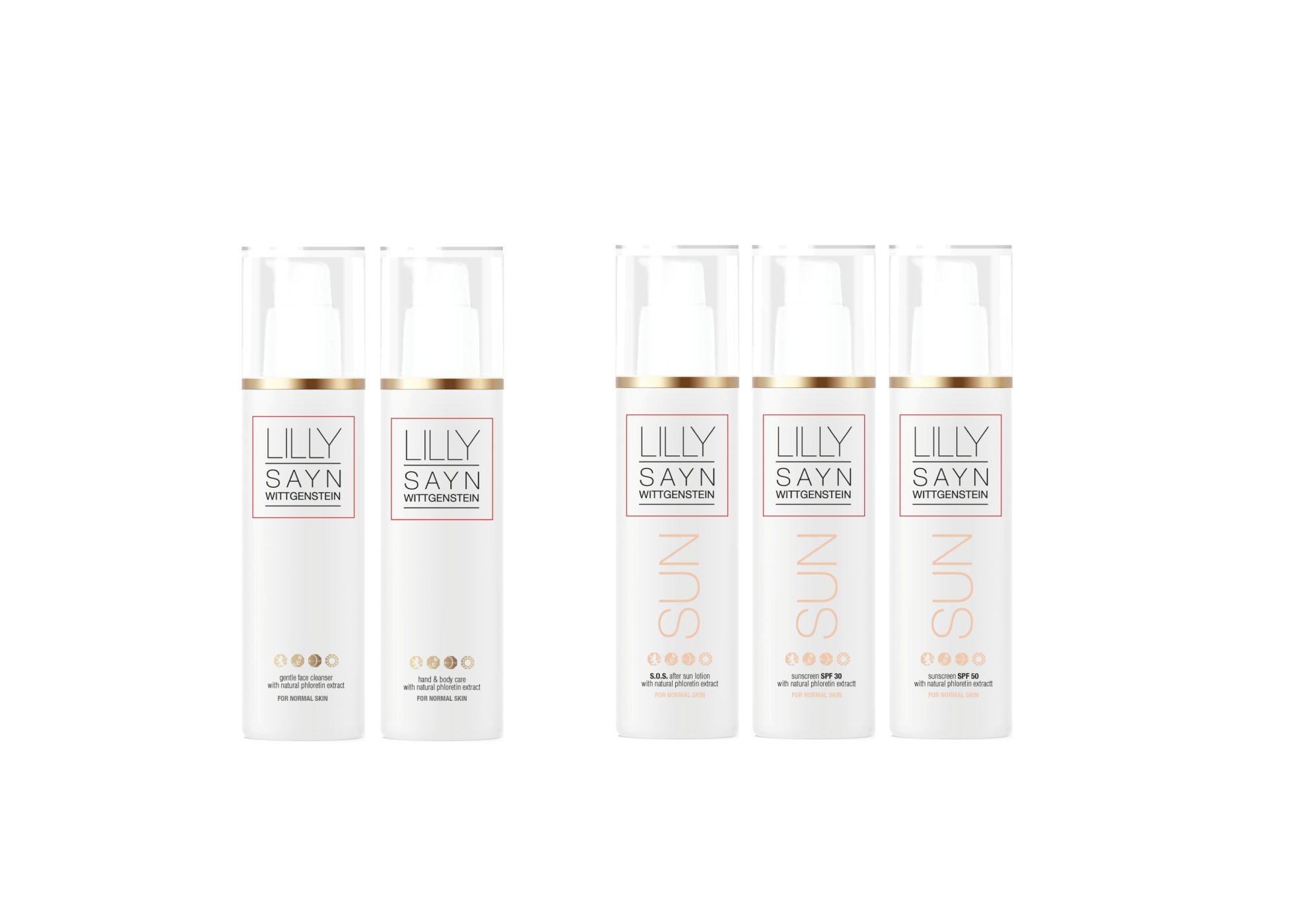 Neben den Gesichts- und Körperpflegeprodukten wird auch der Sonnenschutz durch den sanften und hellorangenen Schriftzug SUN differenziert.