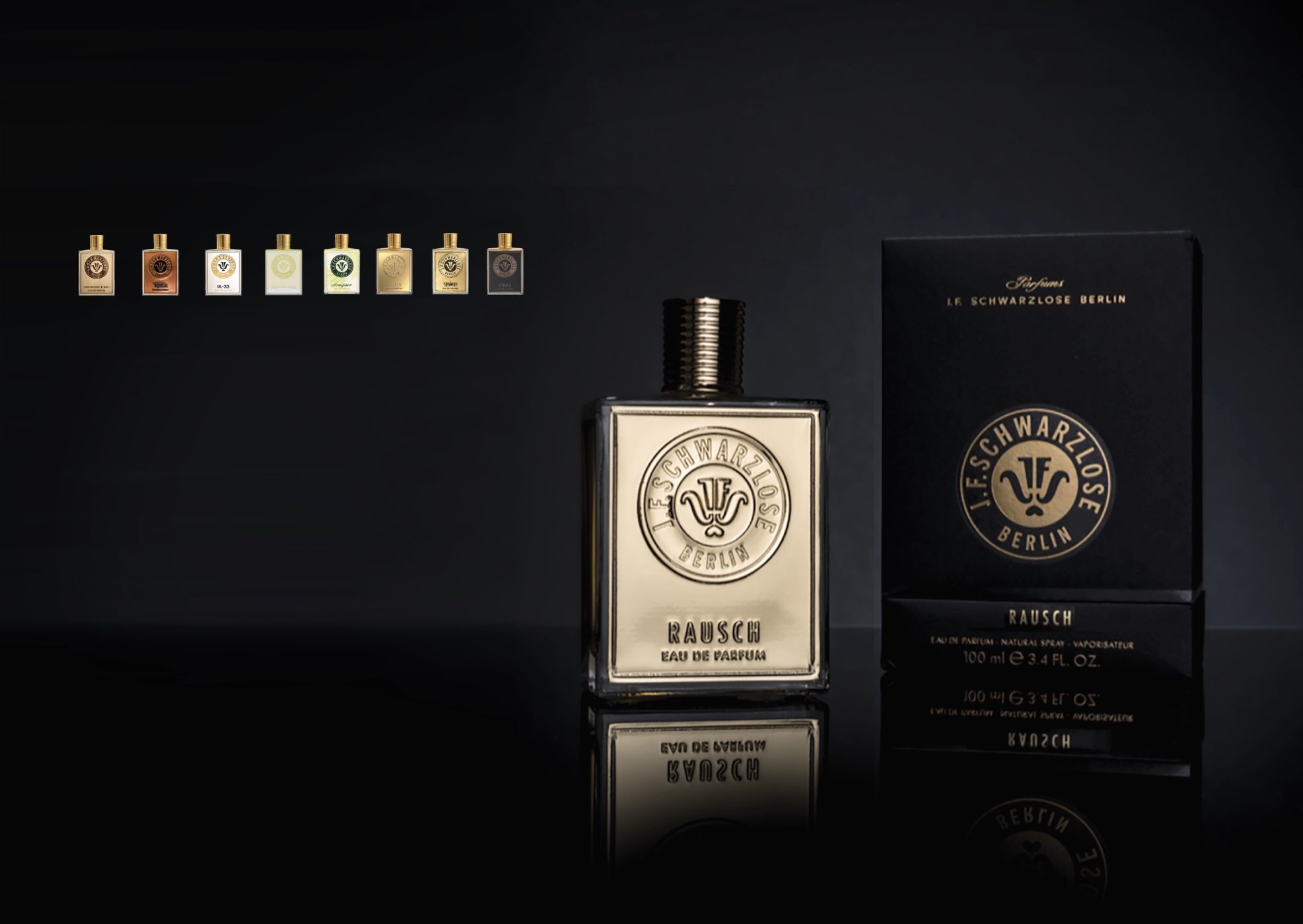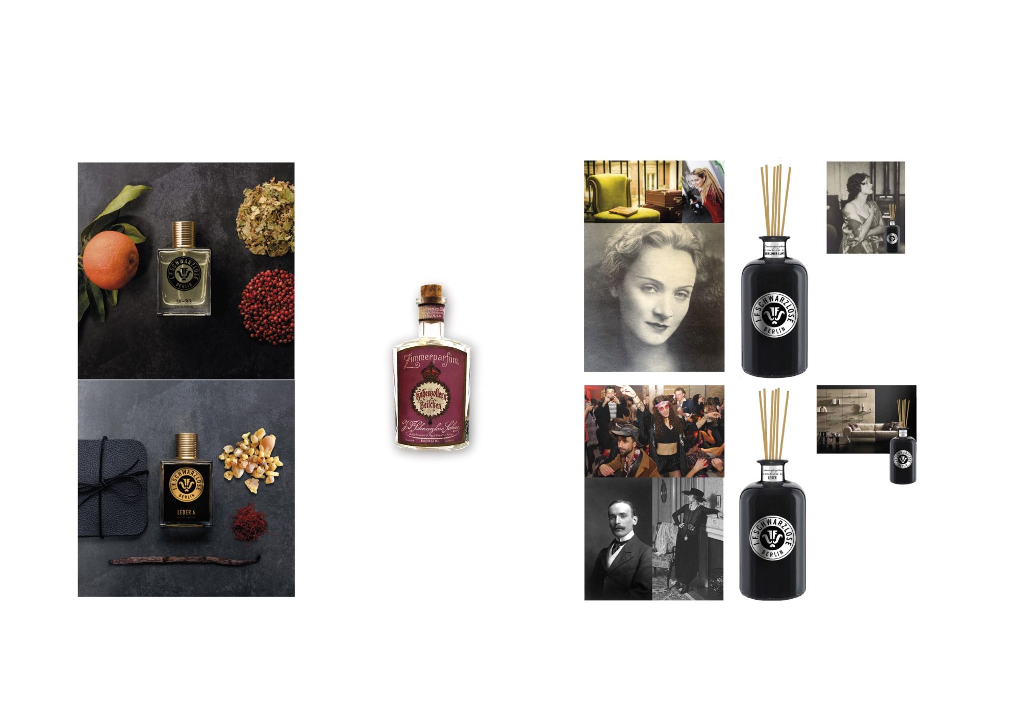 Starkes Branding basierend auf historischem Logo mit individuellen Duftnamen, die die Duftgeschichten vermitteln. Eine starke, einfache Formgebung mit individuell gestaltetem Verschluß.