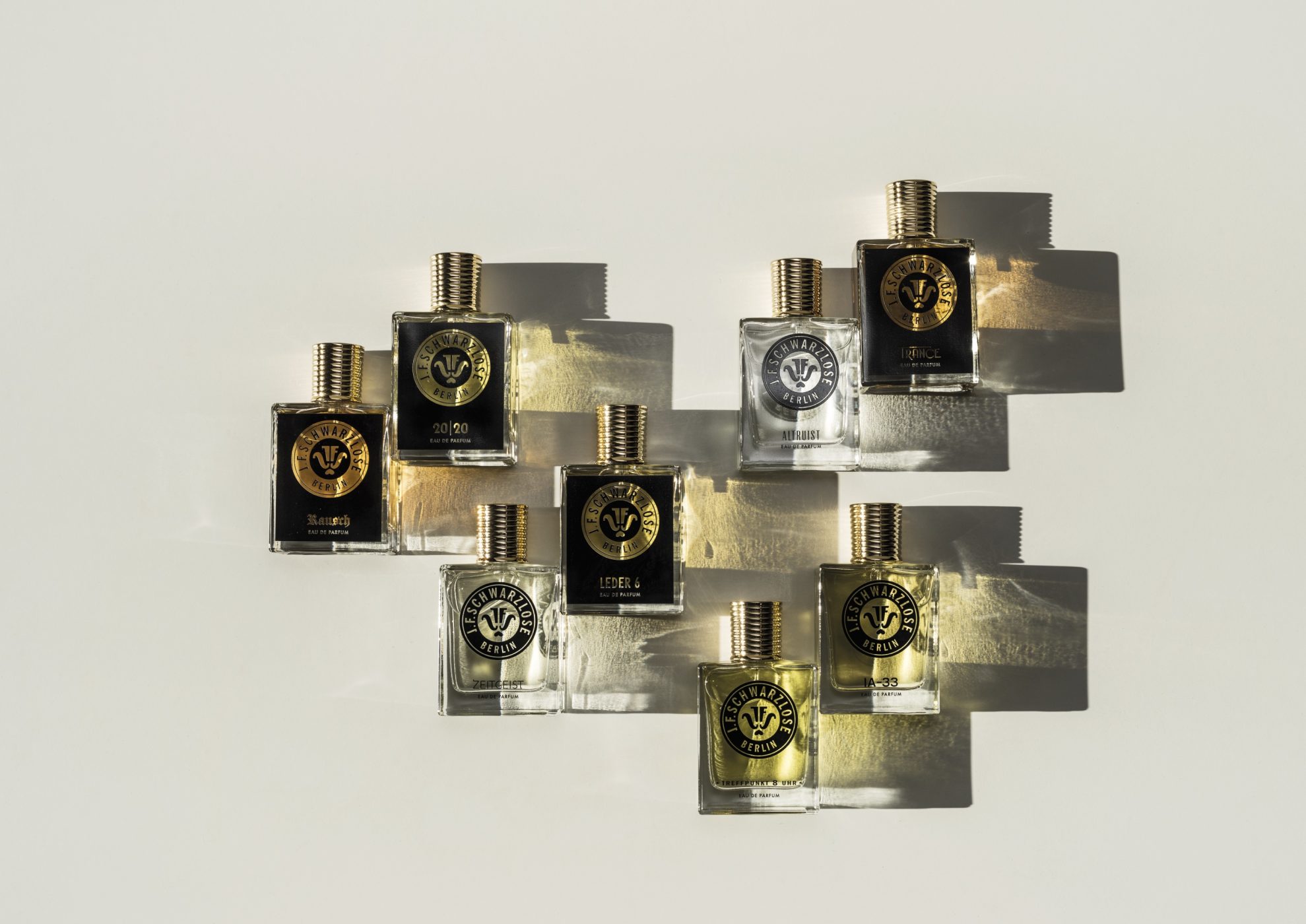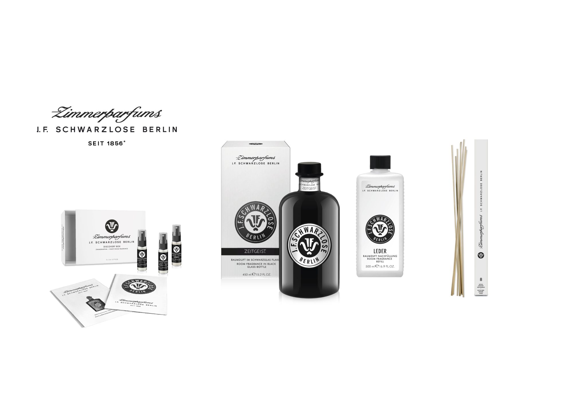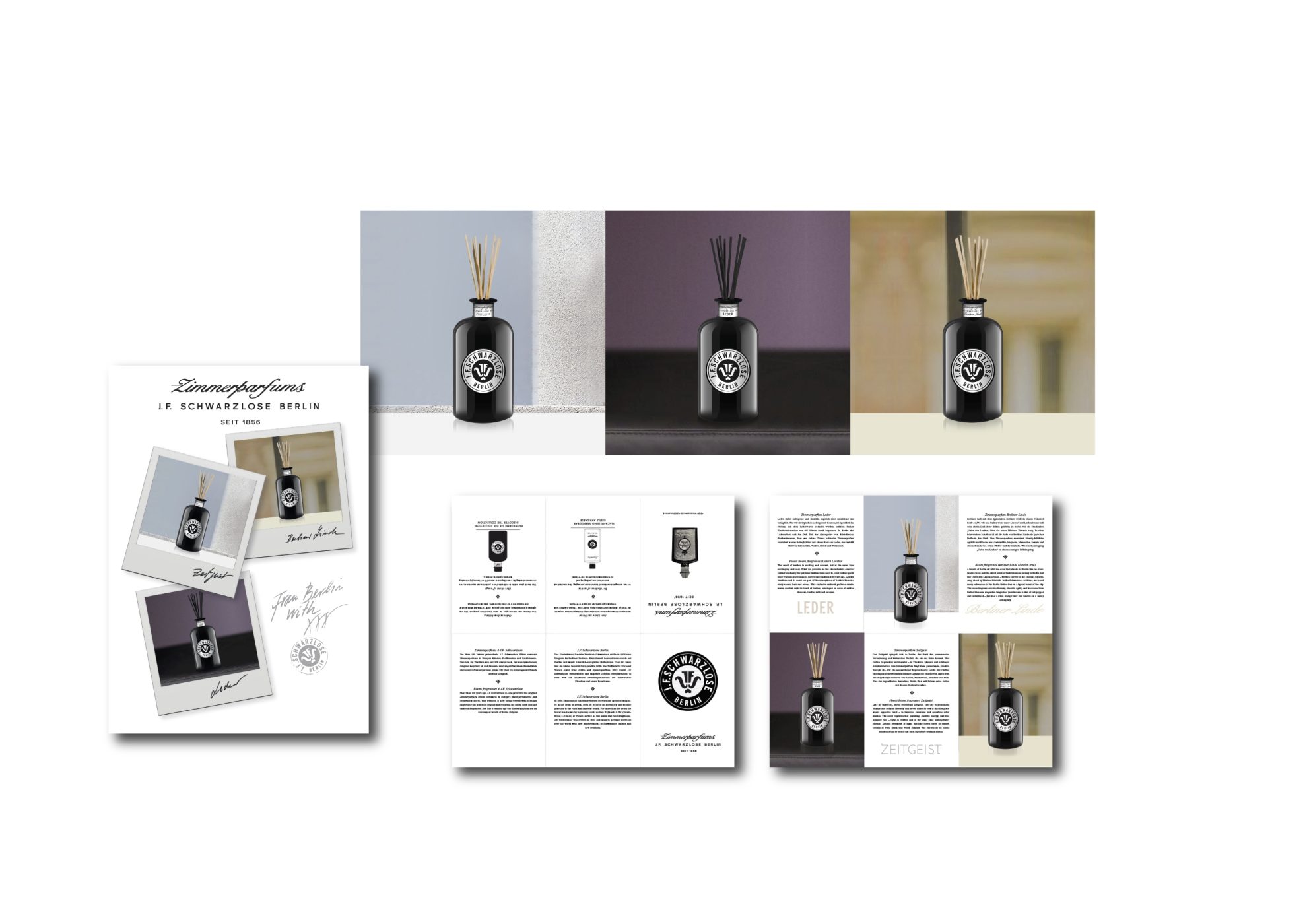 Raumdüfte „Zimmerparfum“ Branding & Verpackung; Schwarz & Weiß ist authentisch und nachhaltig; Schwarzglasflaschen betonen Markentradition.